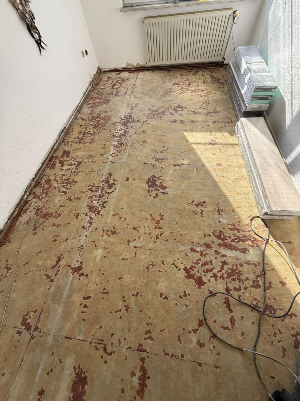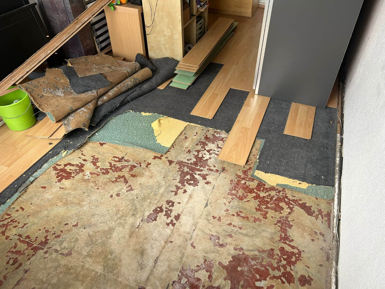 Unter dem Laminat verbargen sich gleich zwei weitere Schichten: ein alter Linoleumboden und – noch kritischer – ein alter Teppich. Mancher denkt sich beim Renovieren vielleicht: „Lass den Teppich doch drin, das dämmt zusätzlich.“ Doch genau hier liegt der Fehler. Während der verklebte Linoleum allein noch kein Problem dargestellt hätte, ist Teppich als Untergrund absolut ungeeignet.