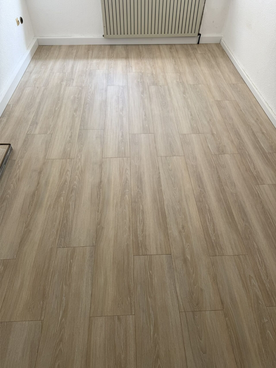 Nachdem der Wasserschaden fachgerecht getrocknet war, gab es für uns nur eine saubere Lösung: Alles muss raus. Wir haben alle drei Schichten der alten Bodenbeläge inklusive der Sockelleisten komplett entfernt. Nur auf einem sauberen, festen Untergrund kann ein neuer Boden wirklich lange halten. Wir haben im Anschluss einen hochwertigen neuen Laminat verlegt, diesmal natürlich mit der fachgerecht passenden Trittschalldämmung.